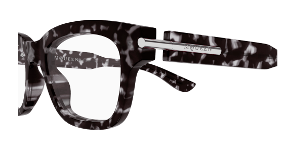 Vista per la prima volta nella collezione Autunno/Inverno 1995 “Highland Rape”, la T-Bar viene rivisitata e reintrodotta come nuova firma della Maison, segnando l’inizio di un capitolo ancora tutto da scrivere. La nuova, iconica T-Bar integrata nella cerniera diventa il punto di congiunzione tra frontale e aste. L’estremità arrotondata della T-Bar, visibile sul frontale, conferisce un tocco ricercato a questa montatura rettangolare unisex, classica e facile da indossare. Il nuovo logo McQueen è inciso al laser sulla T-Bar in metallo.