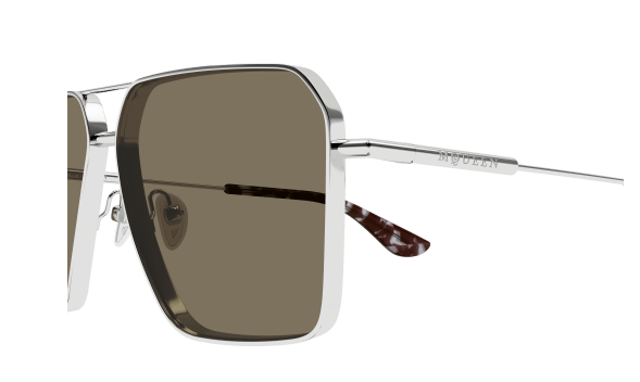 Vista per la prima volta nella collezione Autunno/Inverno 1995 “Highland Rape”, la T-Bar viene rivisitata e reintrodotta come nuova firma della Maison, segnando l’inizio di un capitolo ancora tutto da scrivere. La linea è interamente in metallo, caratterizzata da una T-Bar discreta ed elegante su ponte, musetti e dettagli delle aste, in contrasto con i cerchi metallici spessi 5 mm. Silhouette rettangolare da uomo con doppio ponte. Il nuovo logo McQueen è inciso al laser sulle aste.